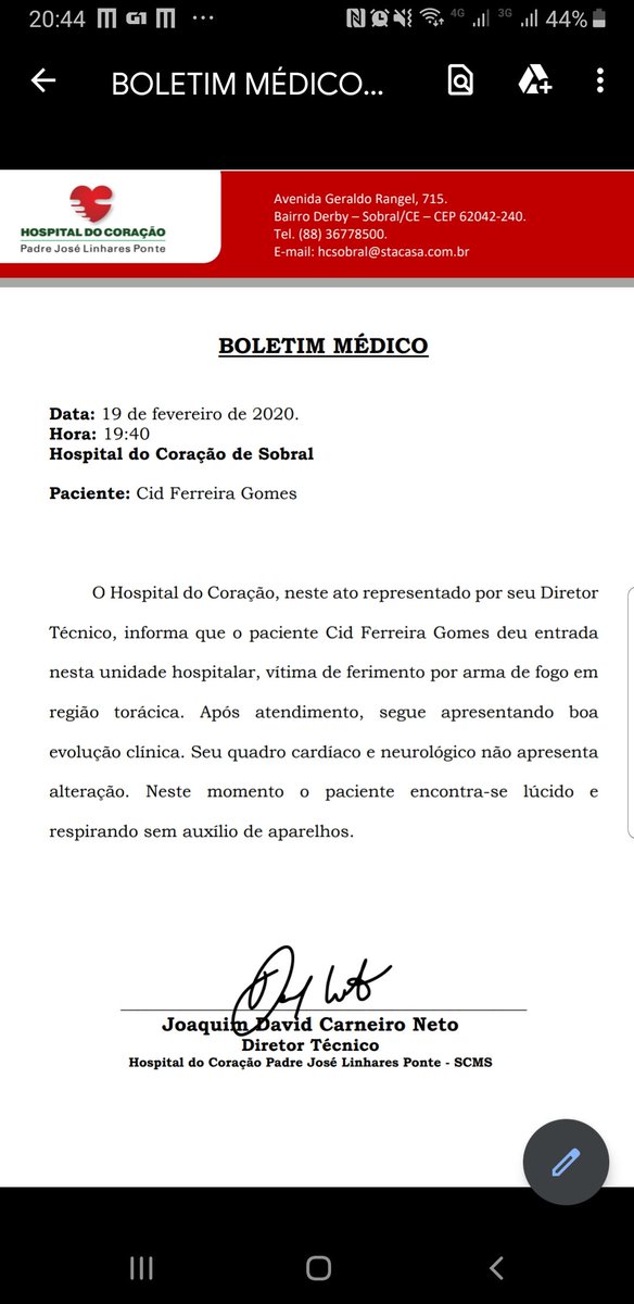 “Novos exames estão sendo feitos, mas a palavra aos familiares e amigos é de que Cid não corre risco de morte”, informou Ciro.