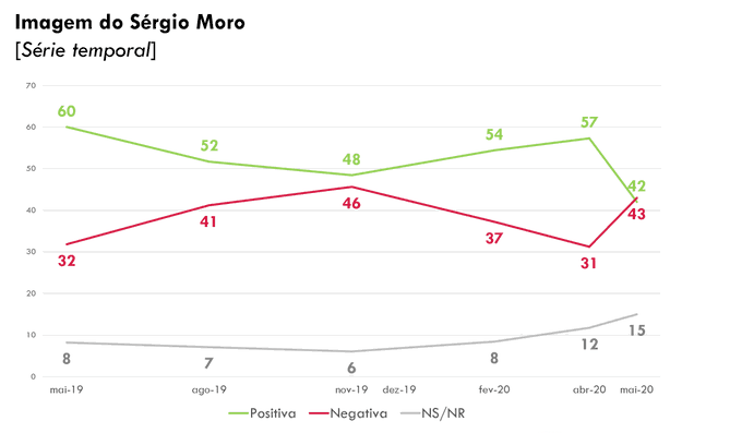 Pela primeira vez na linha histórica, a imagem negativa do Sergio Moro supera a imagem positiva, resultado do desembarque de parte dos simpatizantes do presidente Jair Bolsonaro.