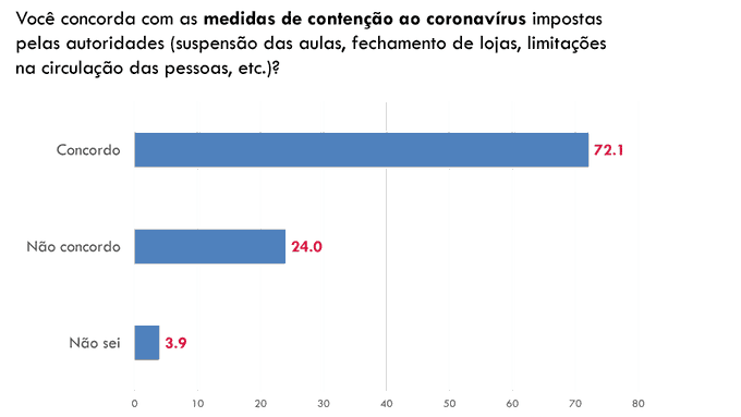 A maioria de 53% considera que as medidas de isolamento deveriam ser ampliadas; 26% acreditam que as medidas deveriam ser relaxadas.