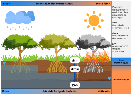 Os resultados do estudo, com base em informações de 2004 a 2016, revelam uma diminuição nas condições de umidade em três níveis – do solo superficial (sfsm), da zona das raízes das árvores (rtzsm) e das águas subterrâneas (gws), sendo este último o que apresenta maior severidade de aridez. São esses “reservatórios” que demoram mais para se recuperar quando afetados por secas consecutivas e extremas decorrentes do El Niño, um dos fenômenos climáticos de maior impacto na Terra.