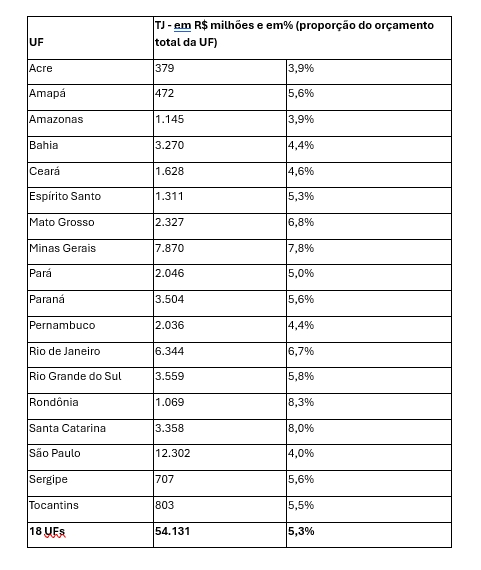 Para se ter uma ideia, em São Paulo, somente os valores destinados ao TJSP, R$ 12,30 bilhões, ultrapassam a totalidade dos recursos voltados às áreas de ciência e tecnologia, legislativa, gestão ambiental, cultura, habitação, assistência social, agricultura, saneamento, comércio e serviços, desporto e lazer, comunicações, trabalho, organização agrária e indústria, que, juntas, somam R$ 12,24 bilhões.