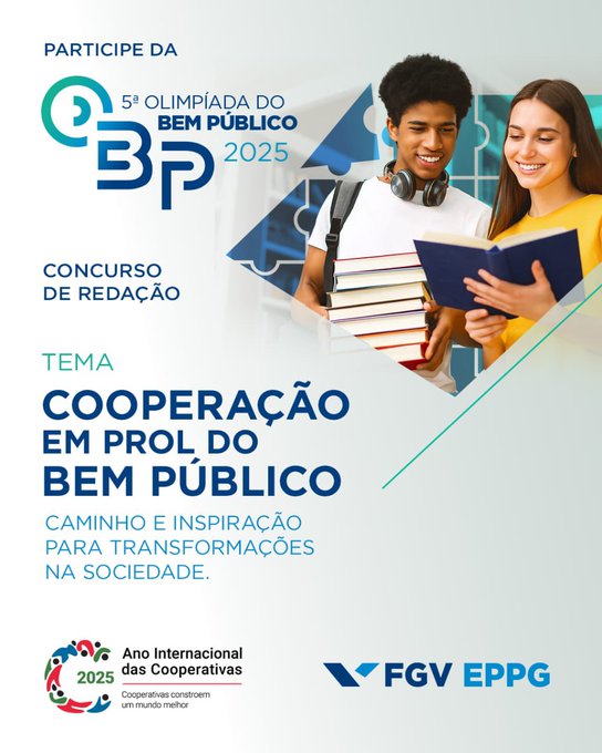 Com o tema "Cooperação em Prol do Bem Público: Caminho e Inspiração para Transformações na Sociedade", o concurso de redação, de caráter nacional, convida estudantes do Ensino Médio de todo o Brasil a refletirem sobre o papel da cooperação na construção de uma sociedade mais justa, equitativa e sustentável. A participação na OBP é gratuita e os estudantes participantes devem ter um professor orientador.