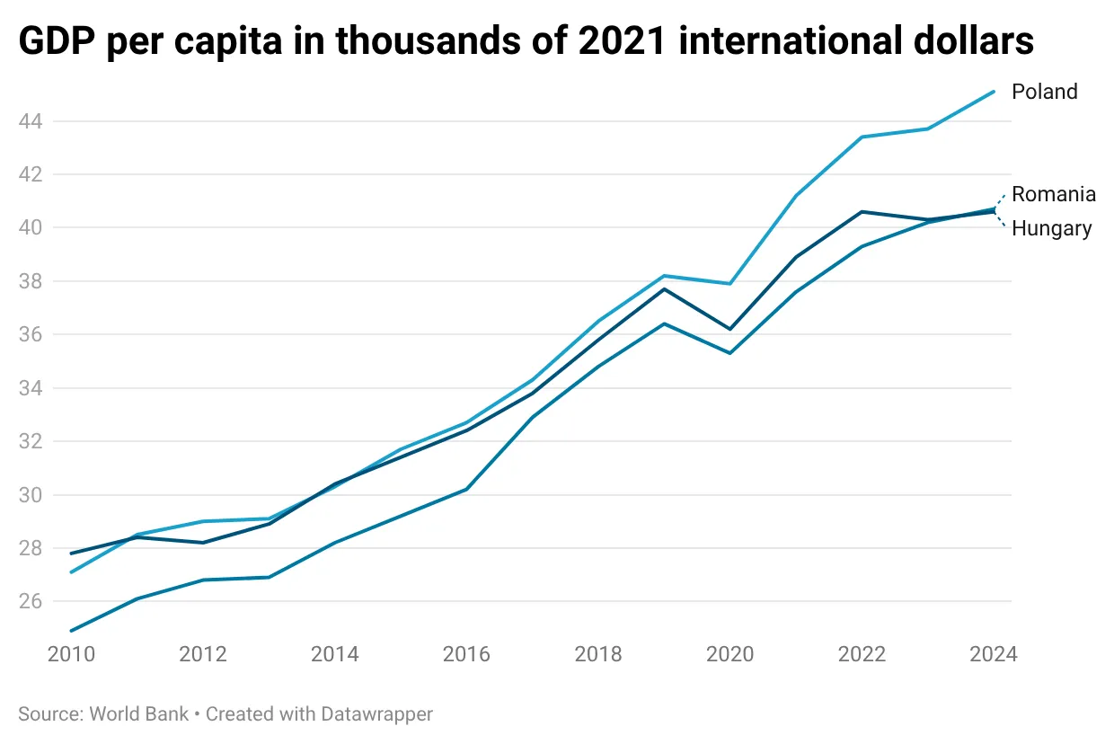 A surpreendente vitória de Peter Magyar no domingo refletiu, em parte, o descontentamento econômico. Quando Orbán assumiu o poder, a Hungria era praticamente tão rica quanto a Polônia e substancialmente mais rica que a Romênia. Desde então, a Polônia ultrapassou-a consideravelmente, enquanto a Romênia a alcançou.